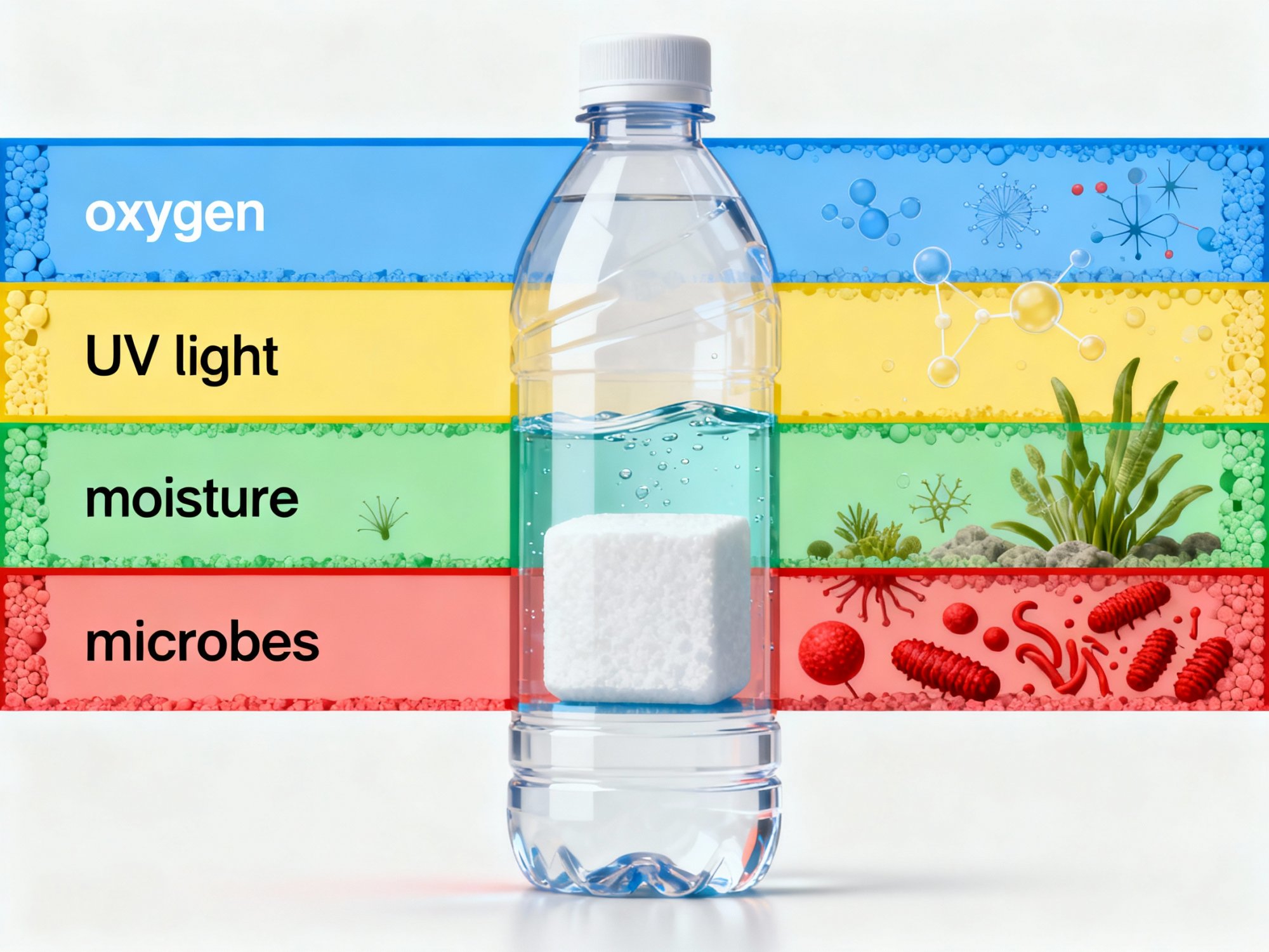 Пластиковая тара защищает содержимое сразу от нескольких разрушительных факторов: кислорода, вызывающего окисление; ультрафиолетового излучения, которое разрушает витамины и активные компоненты; влаги и микроорганизмов, провоцирующих порчу; механических повреждений при транспортировке и хранении.