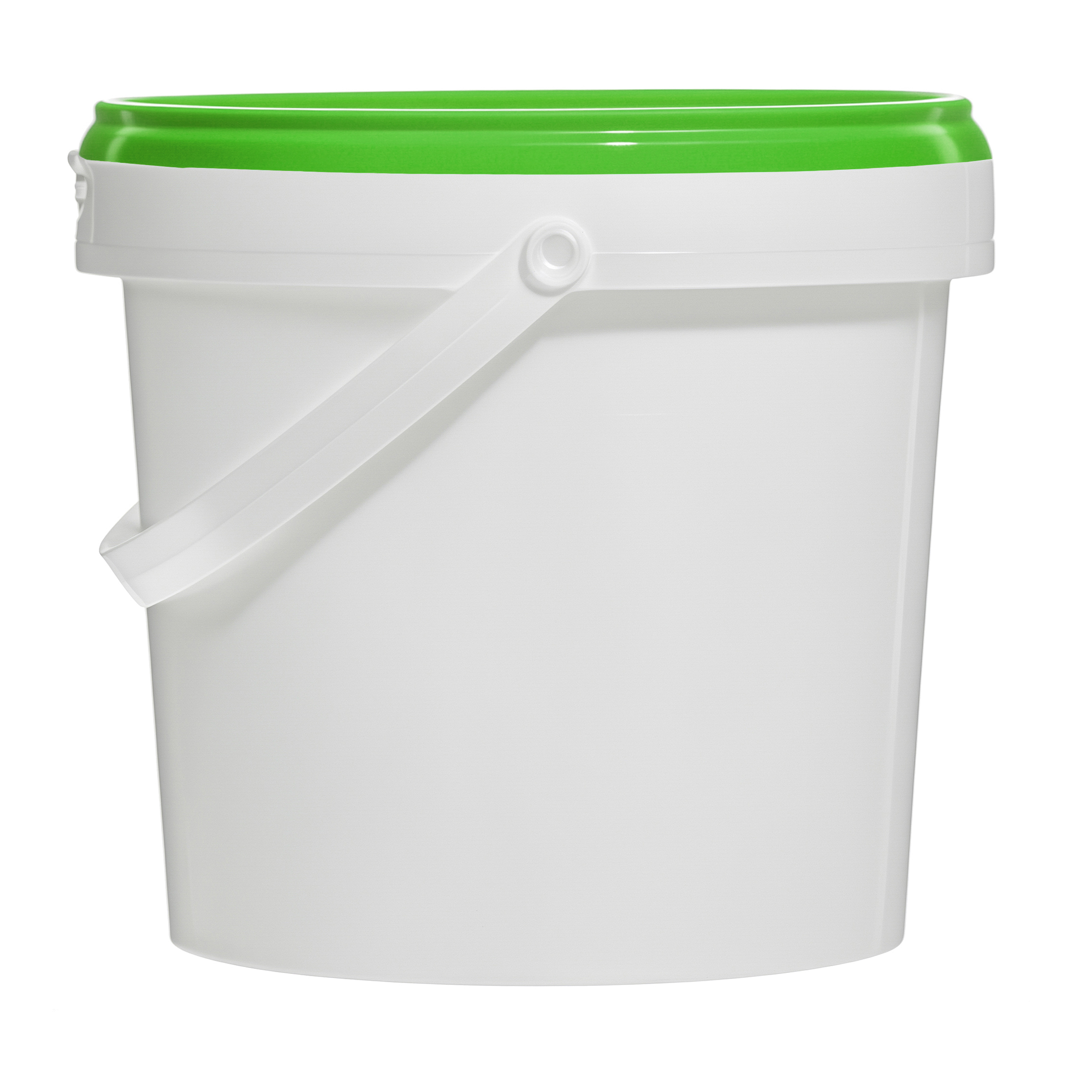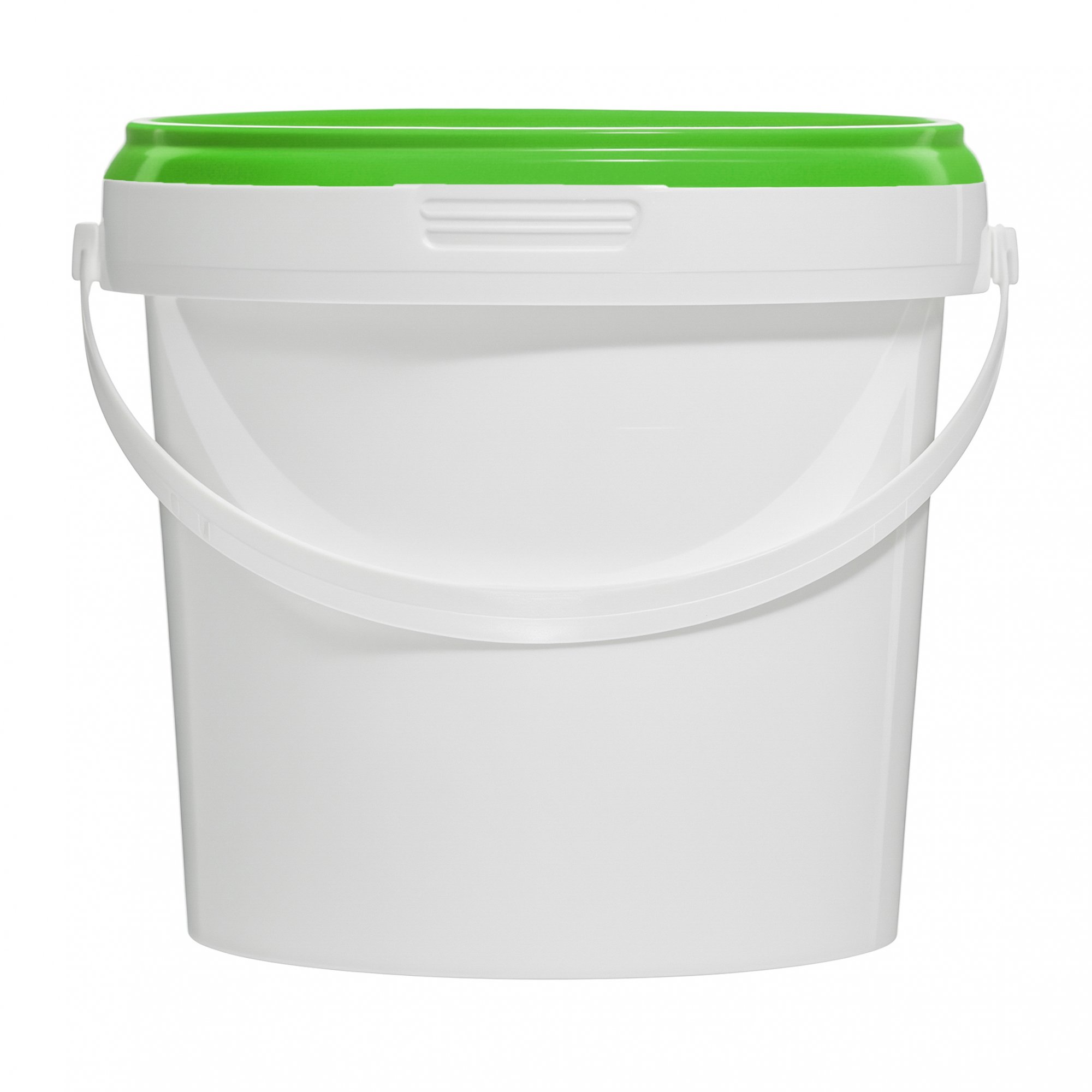 Белое пластиковое ведро объемом 1,1 литра, круглой формы, с ручкой, в комплекте крышка зеленого цвета. Предназначено для хранения и перевозки пищевой и/или промышленной продукции. Оптовые поставки в Екатеринбург