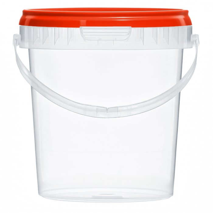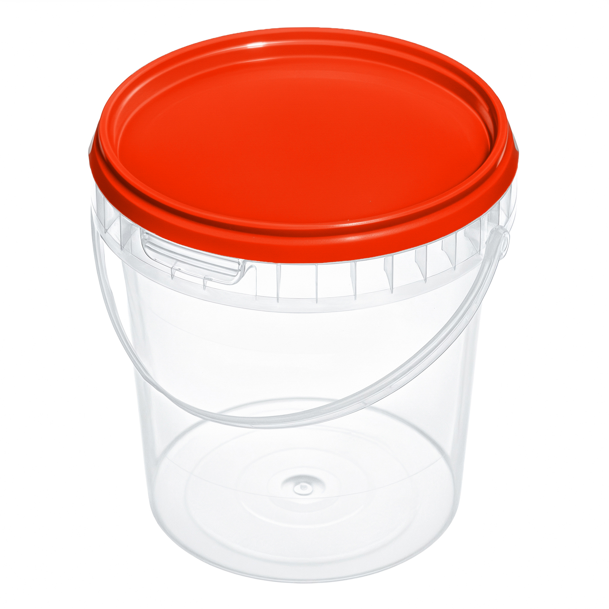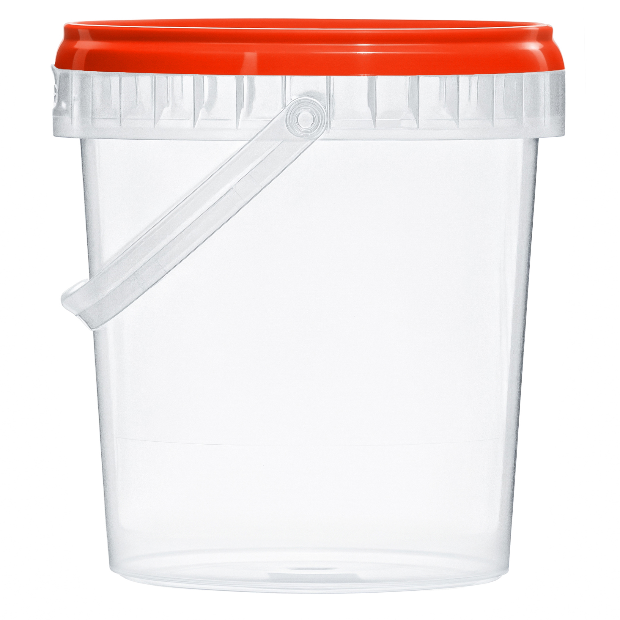 Прозрачное пластиковое ведро объемом 850 мл, с ручкой и крышкой красного цвета. Предназначено для хранения и транспортировки пищевой и промышленной продукции. Можно использовать в быту - для ягод, варенья, меда, или для различных мелочей, таких как пуговицы, бусины, бисер и другие мелкие предметы.