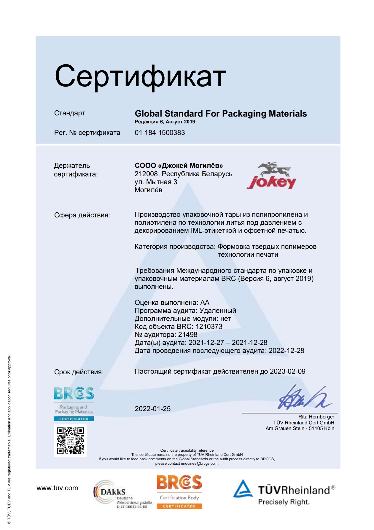 Сертификат соответствия качества для пищевой продукции BRC 2023